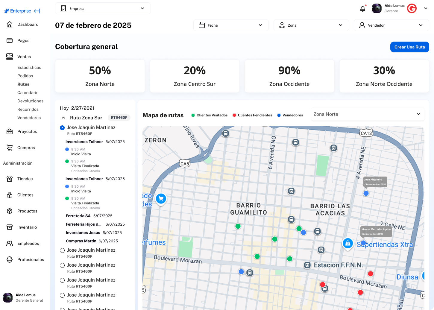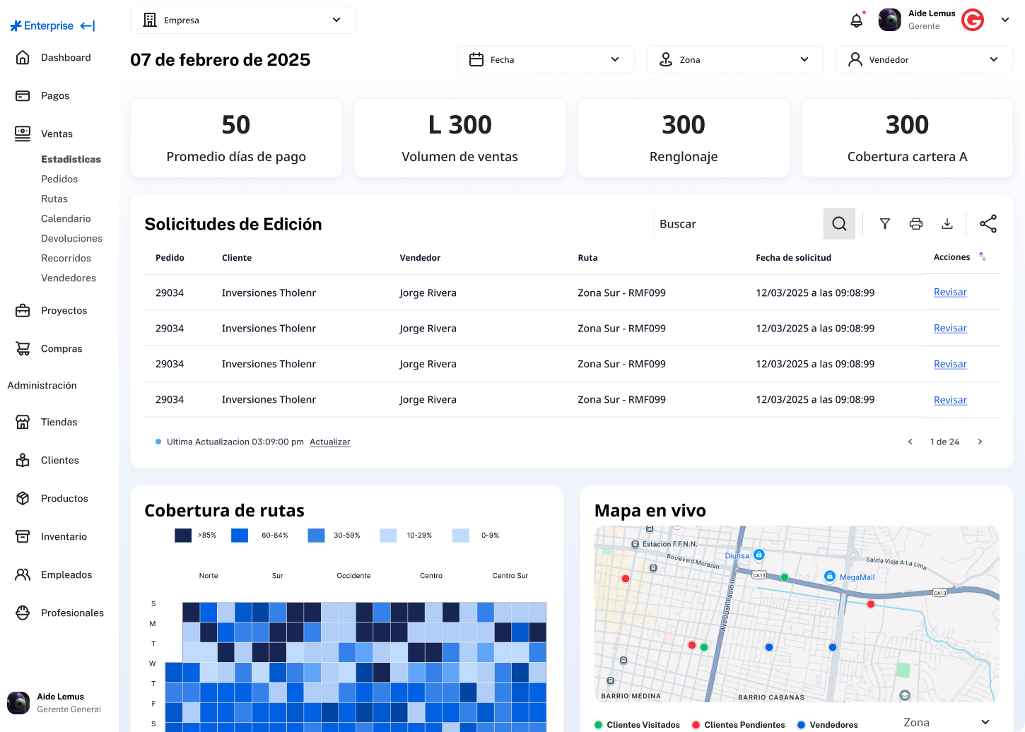 Filtros por zona, ruta, representante y cliente; exportación a BI/APIs para reportes ejecutivos.